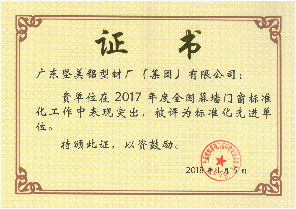 2018.1月 標(biāo)準(zhǔn)化先進(jìn)單位證書:廣東堅美(全國建筑幕墻門窗標(biāo)準(zhǔn)化技術(shù)委員會)